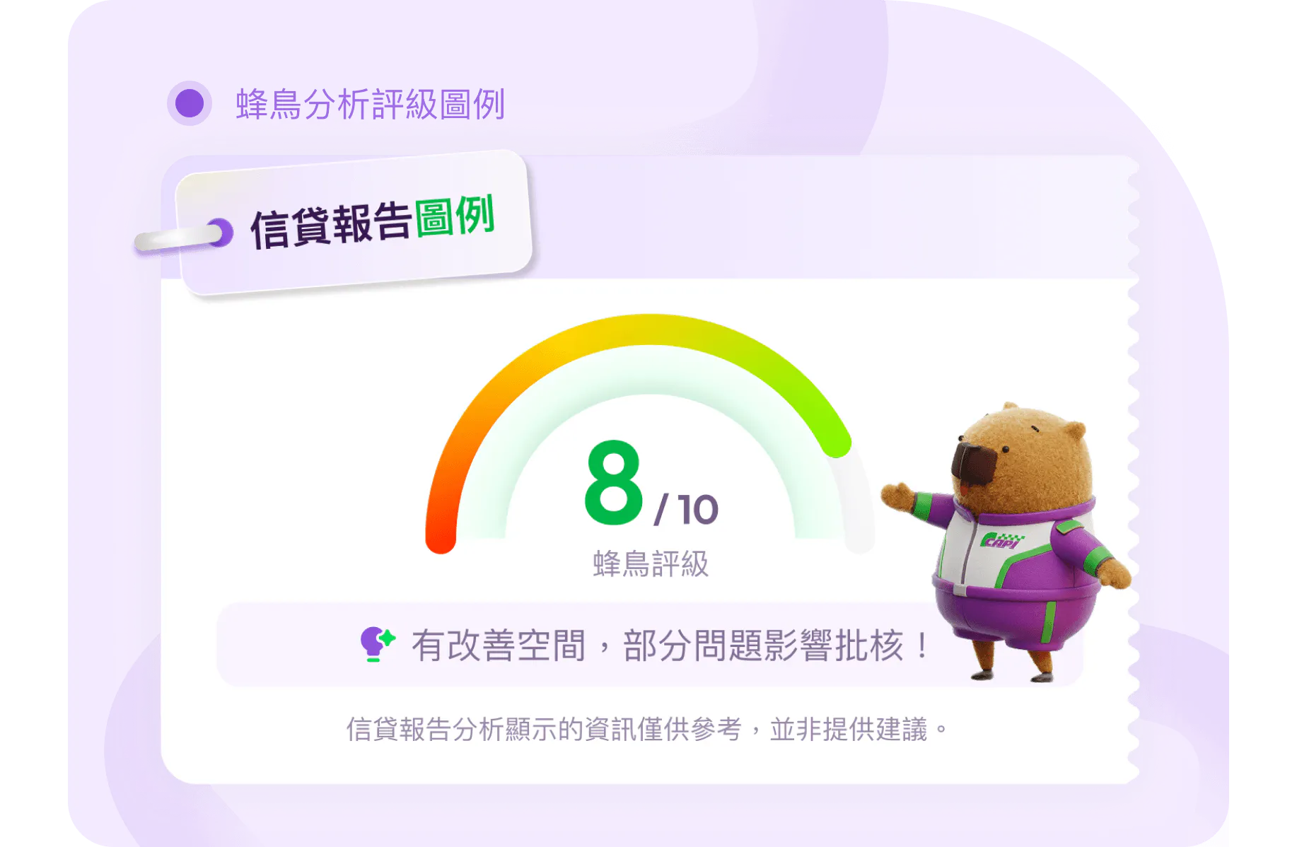 蜂鳥分析評級綜合評估你的申請習慣、還款紀錄、負債比率及信貸年資,以 0 至 10 分呈現你的整體信貸健康指數(蜂鳥評級)。評級越高,代表信貸狀況越理想,財務自由度越大。